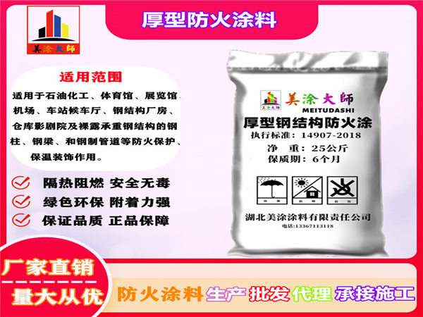产品名称厚型钢结构防火涂料   品牌:美涂大师    产品规格:25kg/袋   产品颜色:浅灰色   产品品质:无毒 环保   产品性能:强度高、耐水、耐酸碱、抗冻、不易老化的特点  使用范围:石油化工、体育馆、展览馆、机场、车站候车厅、钢结构厂房、仓库影剧院及裸露承重钢结构的钢柱和钢制管道等防火保护、保温装饰作用